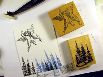 Pines & Rocks was stamped twice in black and two more times in a dark blue using dye based inks. The blue toned pines will represent distance. Cherubs (Ornamentum) stamped in black.