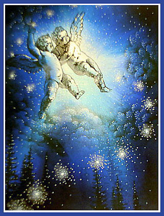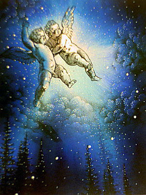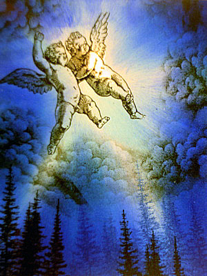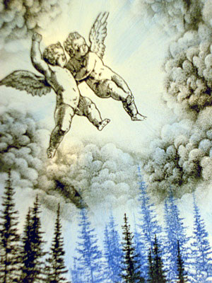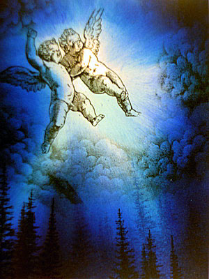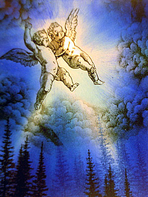 White dots were applied to the scene with a White Gel Pen. I've highligted the clouds and trees and put a serpentine line of larger dots rising and wrapping around the cherubs.