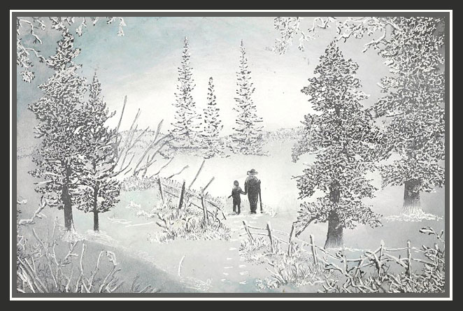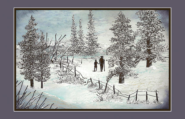 First of all, the dragging with the reinker inks for the background. Secondly, I used three stamps like a texture stamp or Tonal Applicator (Cloud Bits, Tall Grass Small, and Sedge Filler) to create texture in the sky and snow. I also stippled Moonlight White Brilliance over lower sky and horizon line to soften the transition and create the illusion that it was snowing. The horizon itself was created using just the top of soft hill on the left, and just the bottom of the same stamp on the right.