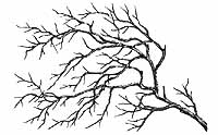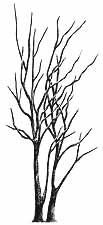 Trees and tree parts in various sizes will add spatial relationships to your two dimensional surfaces. In general, on a spatial plane, I like to stamp images that are representationally closer to the viewer --than the other images--lower on the page (with the exception of overhanging branches, leaves, etc.). The bare limbed images are a nice addition to any scene. By stamping them in a dark color over a background you can achieve contrast-depth, framing of a scene, and adding a common element through several areas (especially with "Leafless Limbs Lg." or "Bare Branch Lg."). These large images can start at the bottom of a page and run through land or water up into the sky. It acts like a needle and thread "sewing" the regions together. |