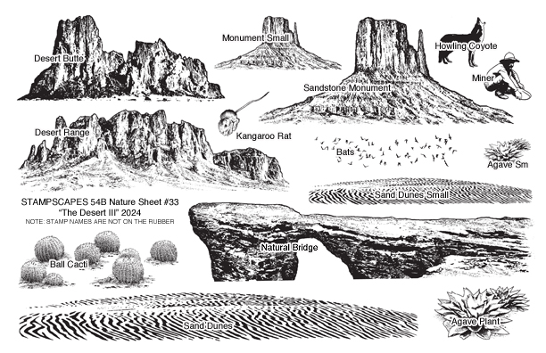 Bats, Howling Coyote, Miner. Nature Sheet 33 is approximately 8.5" x 5.5". Stamps are assorted sizes. 14 Stamps. Options below. |