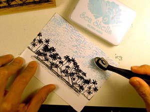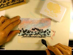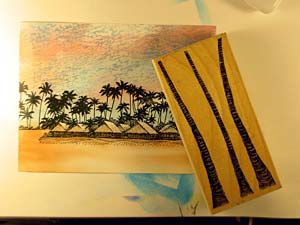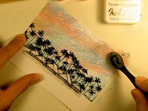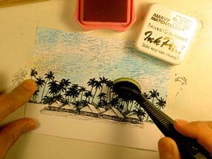 Ranger Sea Shells "Ocean Aqua" was streaked into the sky using a Colorbox Stylus Tool. I left some of the areas of the sky white to represent clouds.