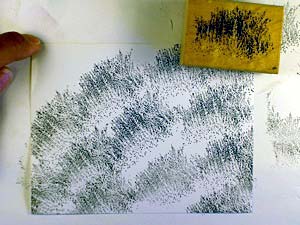 Grass Texture was stamped in black in multiple impressions. I wanted this to appear as though it was a hill so I stamped the images at an angle