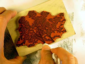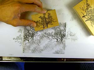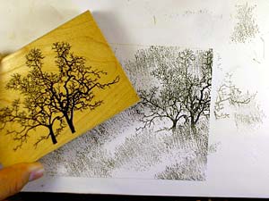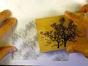 Oak Tree (medium) was stamped in the background. The smaller version was used here to create the illusion of depth in the scene. Image stamped in black.