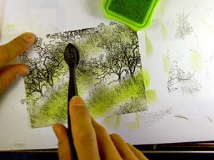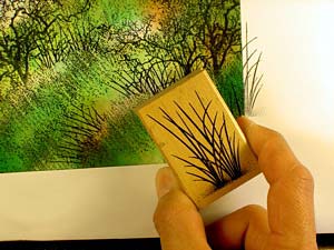 Oak Tree Lg was stamped into the grassy texture. I wanted the trunks to disappear into the grass so I wiped off the bottom of the trunks before I made my impressions. The trees were stamped in a Marvy #1 Black.