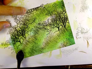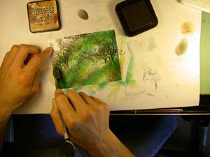 Ranger Sea Shells "Sea Grass" was sponged on to the grassy hillside. Some areas were left the white of the paper to create variation and lighting in the scene. Don't tone out everything.