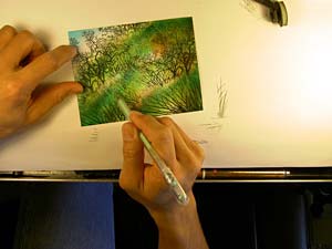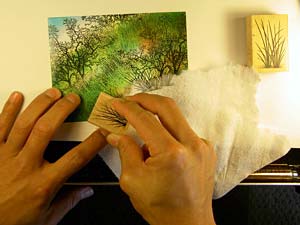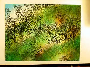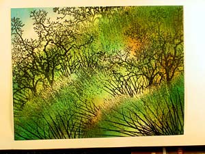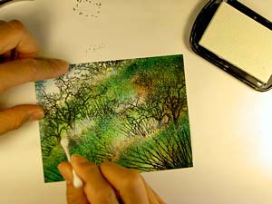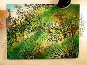 Colorbox "Frost White" pigment ink was applied to the meadow in a couple areas in very thin transluscent layers using a Q-Tip or cotton swab. This thin layer of pigment ink represents a slight hovering morning mist or fog.
