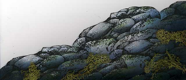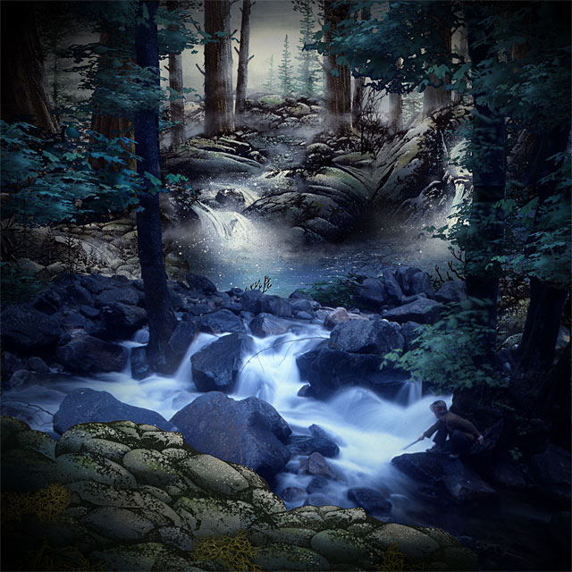 Adobe Photoshop was used to separate the rocks on the photo below from the background trees. The stamped scene was positioned in its place. The large foreground trees in the photograph needed to be extended to reach the top of the scene so they were digitally extended. The entire scene needed to be softened where harsh transitions between the stamped scene and photo took place. My solution was to digitally copy the cluster of leaves above the figures head and to replicate that element throughout the scene in varying sizes. |