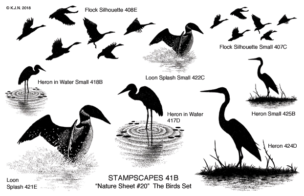 FLOCK SILHOUETTE SMALL 407C, FLOCK SILHOUETTE 408E, HERON IN WATER 417D, HERON IN WATER SMALL 418B, LOON SPLASH 421E, LOON SPLASH SMALL 422C, HERON 424D,